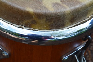 Dieser Teil ist durch eine feste Wand getrennt vom oberen Teil der Trommel, dem Klangkörper, der mit dem Schlagfell bespannt ist. Leider ist mir nicht ganz klar, wo Druck und Sound „herauskommen“ aus diesem geschlossenen Raum (der oben vom Fell und unten vom Boden begrenzt wird). Bei den meisten Trommeln ist ja der untere Teil des Körpers einfach offen oder, wenn nicht (wie bei der Surdo↑ oder der ghanaischen Sogo↑), dann wird oft einfach ein kleines Loch in der Seitenwand der Trommel gelassen. Ähnliches habe ich bei der Pahu nicht gefunden.