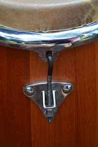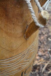 Das (Kuh)Fell ist in einem Metallring gefasst und wird von 7 – 8 Pflöcken, die rund um den Trommelkörper angebracht sind, über Schnüre gespannt (sog. Pflockspannung).