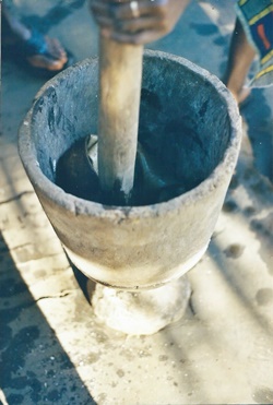 Hier wird das Fell für eine Dundun durch Wässern und Stampfen geschmeidig und weich gemacht.