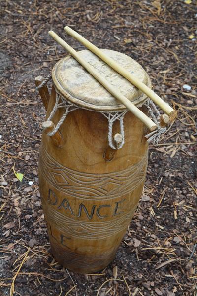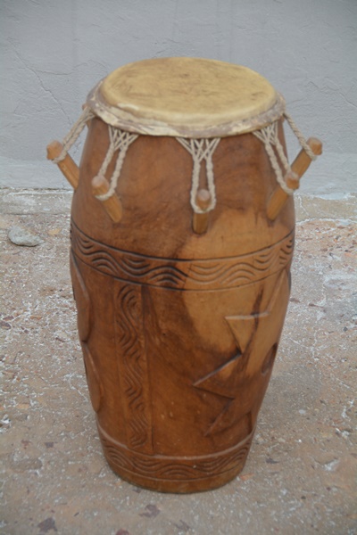 Mit einem Holzkörper aus einem Stamm und mit zwei Kuhfellen bespannt. Die Dundun erzeugt sehr tiefe Töne. Sie ist eine Begleittrommel und wird in der Regel „liegend“ gespielt, d.h. dass der Trommelkörper parallel zum Erdboden liegt. Sie kann aber auch „stehend“ gespielt werden, wie auf dem „Familienbild“ oben zu sehen.
