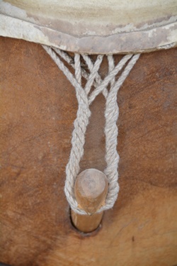 Hier sieht man, wie das Spannseil durch ein Loch im Fell gezogen ist und ein Ring das Fell hält